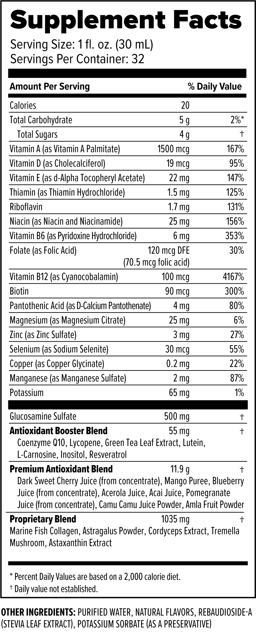 Valé30 also contains your daily dose of glucosamine to preserve joint health, and provides 95% of your daily recommended intake of vitamin D3. And if that’s not enough, Valé30 is also packed with vitamins B1, B12 and B6.